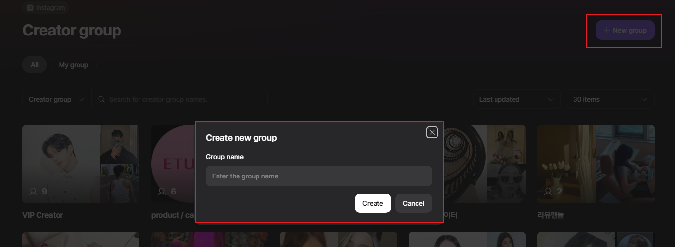 ** If you create a group with creators already associated with your brand, you’ll be able to view only "new creators."