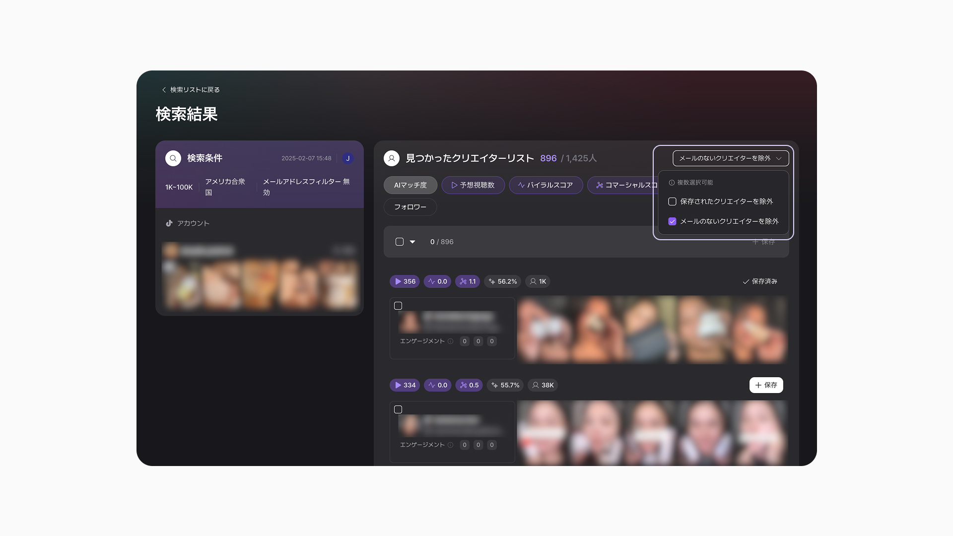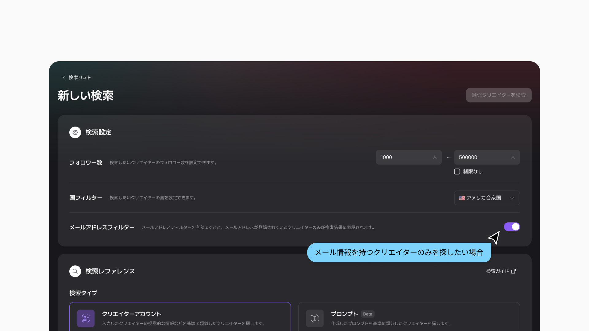 これからは検索作成の段階で、メール有無フィルターを使って、メールアドレスを保有しているクリエイターのみを検索できるようになりました。
