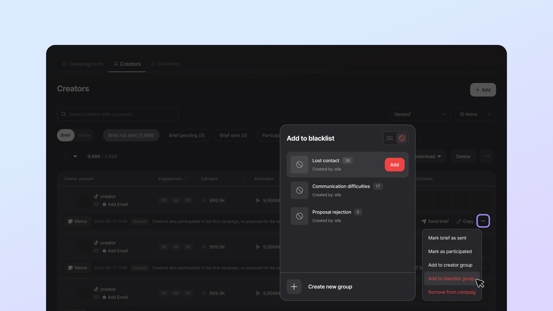 不要なクリエイターとのコラボレーションをブラックリスト設定で自動的にブロックし、