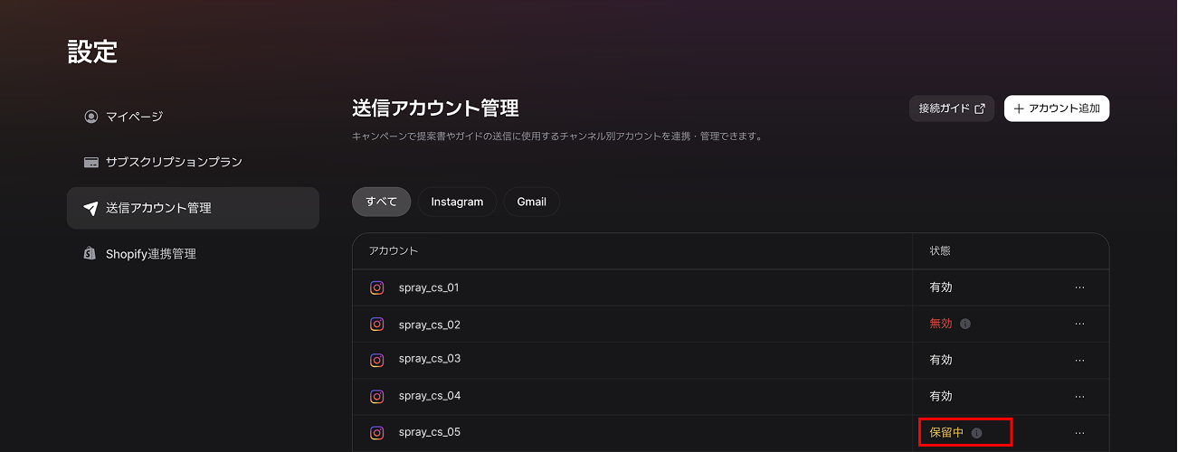 信アカウント「一時停止」ステータス参考画面(出典:Spray.io)
