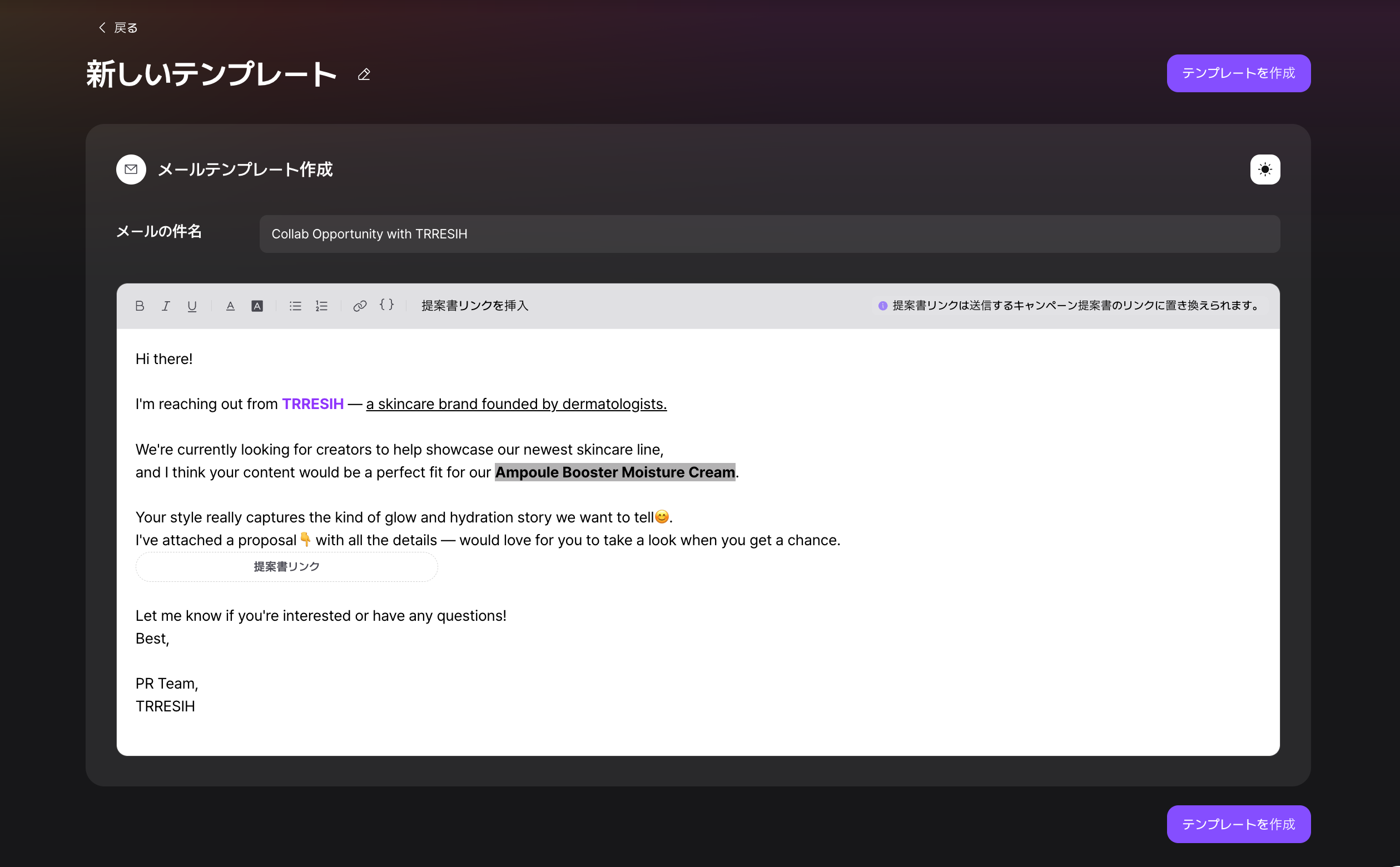 { }: このボタンを使用することで、クリエイターのIDを挿入したパーソナライズメッセージを送信できます。提案書リンクを挿入: 提案書リンクボタンを本文に追加できます。リンクは各キャンペーンの情報に応じて自動的に更新されます。