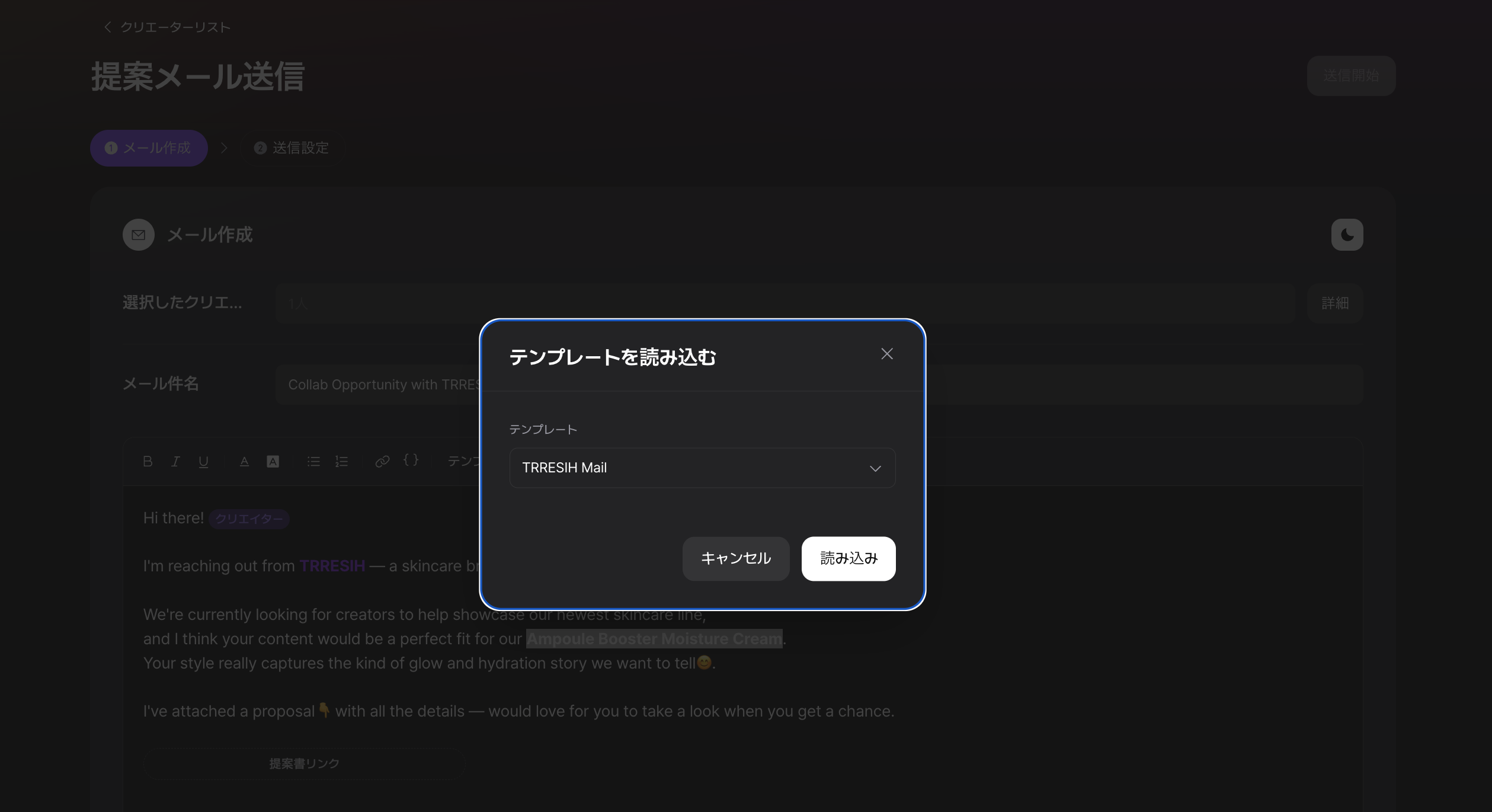 キャンペーンのアウトリーチメッセージを作成する際に、保存したテンプレートを読み込んでそのまま使用できます。