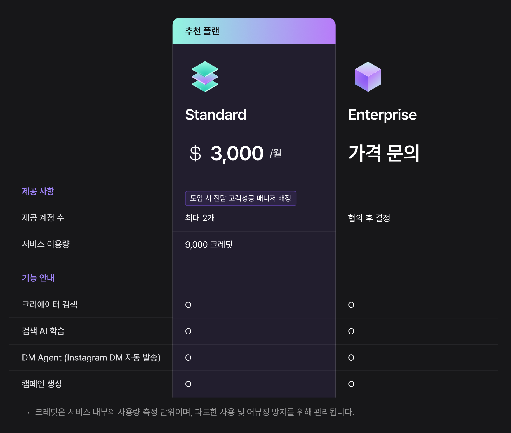 일반 기업보다 예상 사용량이 월등히 높은 마케팅 대행사 혹은 큰 규모의 브랜드들이 견적 협의 후 도입 절차로 넘어갑니다.