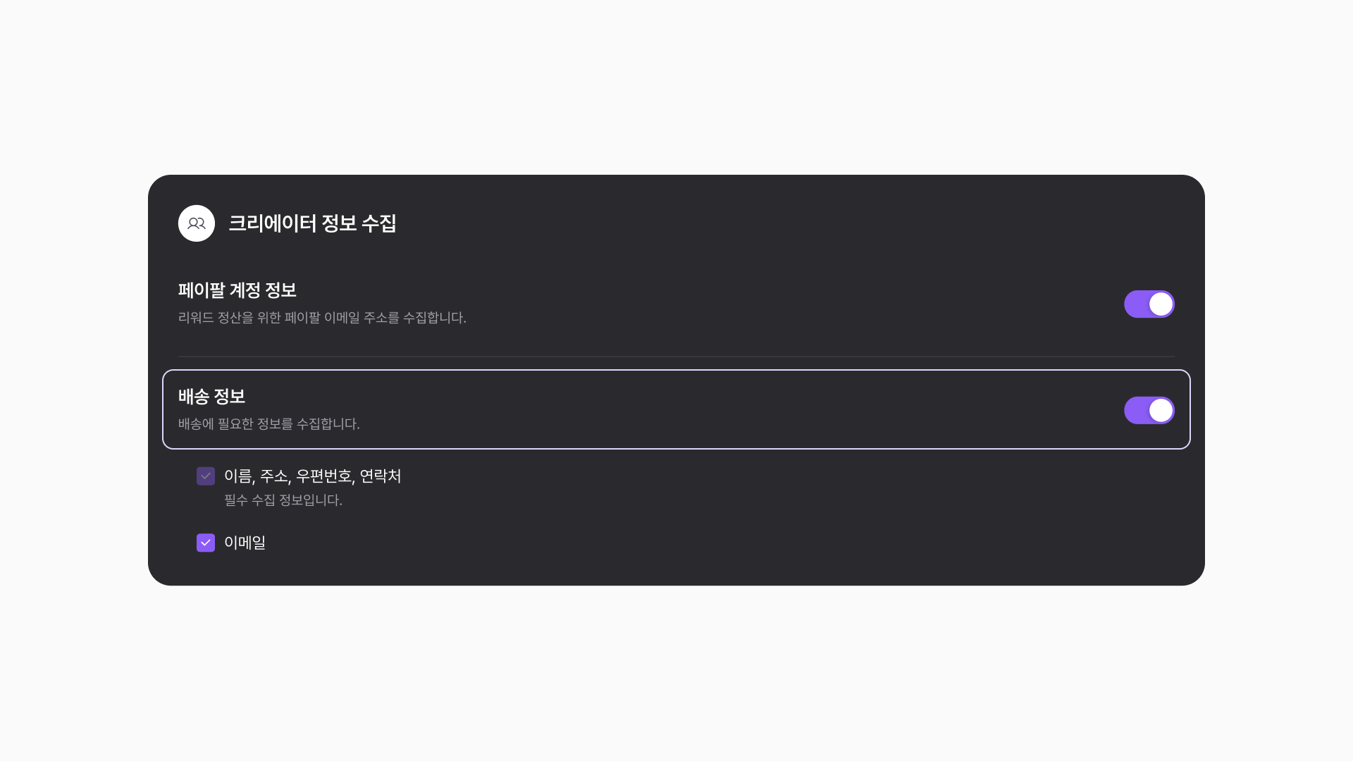이제 제안서 작성 화면의 크리에이터 정보 수집 섹션에서 참여자의 배송 주소와 페이팔(PayPal) 계정 입력 필드를 제안서에 추가할 수 있습니다.