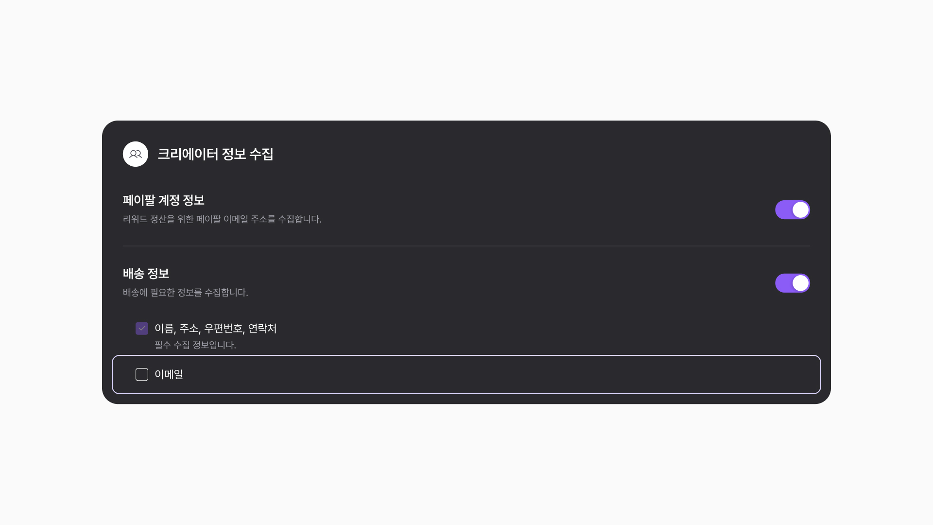 크리에이터 정보 수집 섹션에서 페이팔 계정 정보 항목을 활성화해 보세요.