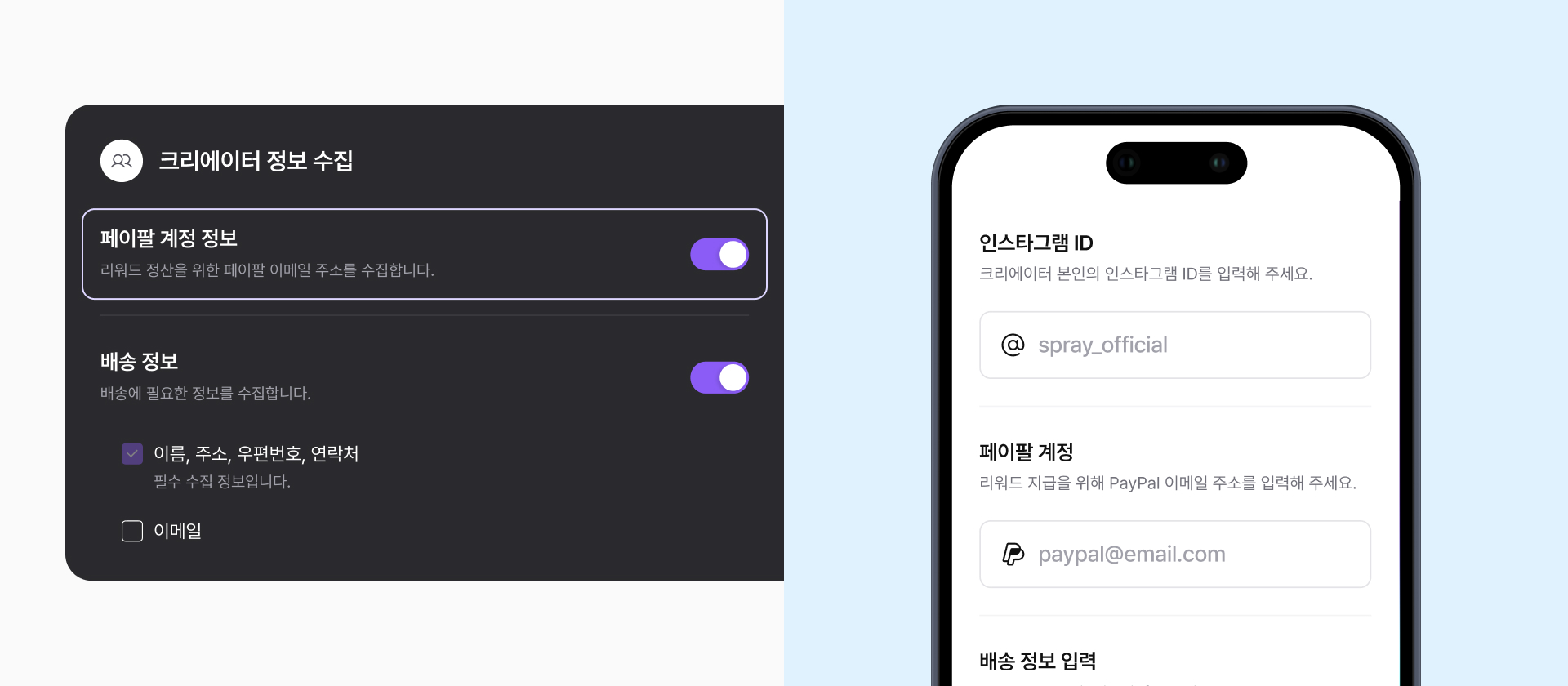 크리에이터로부터 페이팔 계정을 미리 수집하여, 리워드 정산 관련 소통 리소스를 줄일 수 있습니다.