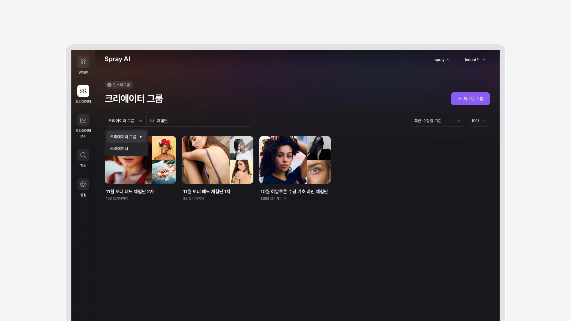 크리에이터 그룹 목록에서 그룹 명 또는 크리에이터 아이디를 검색할 수 있습니다.