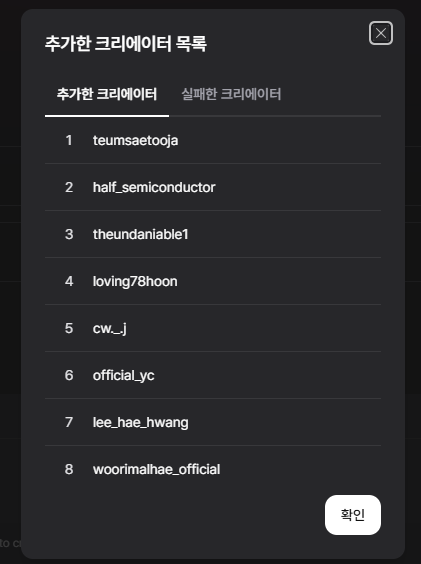 만약 그룹 내에 중복되는 크리에이터가 있을 경우, 해당 크리에이터는 제외하고 새로운 크리에이터만 추가됩니다.