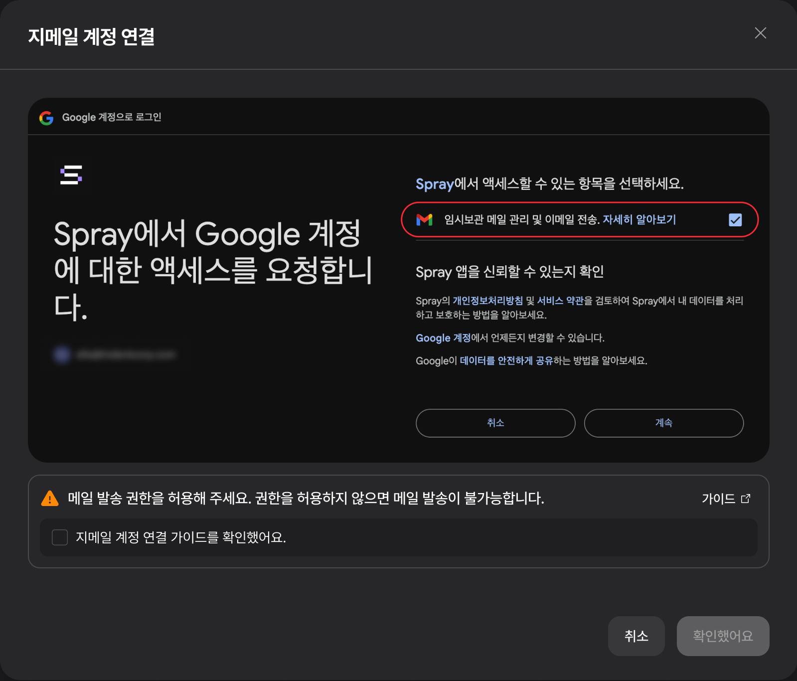 메일 발송에 필요한 권한을 확인하고 반드시 꼭 허용해 주세요.