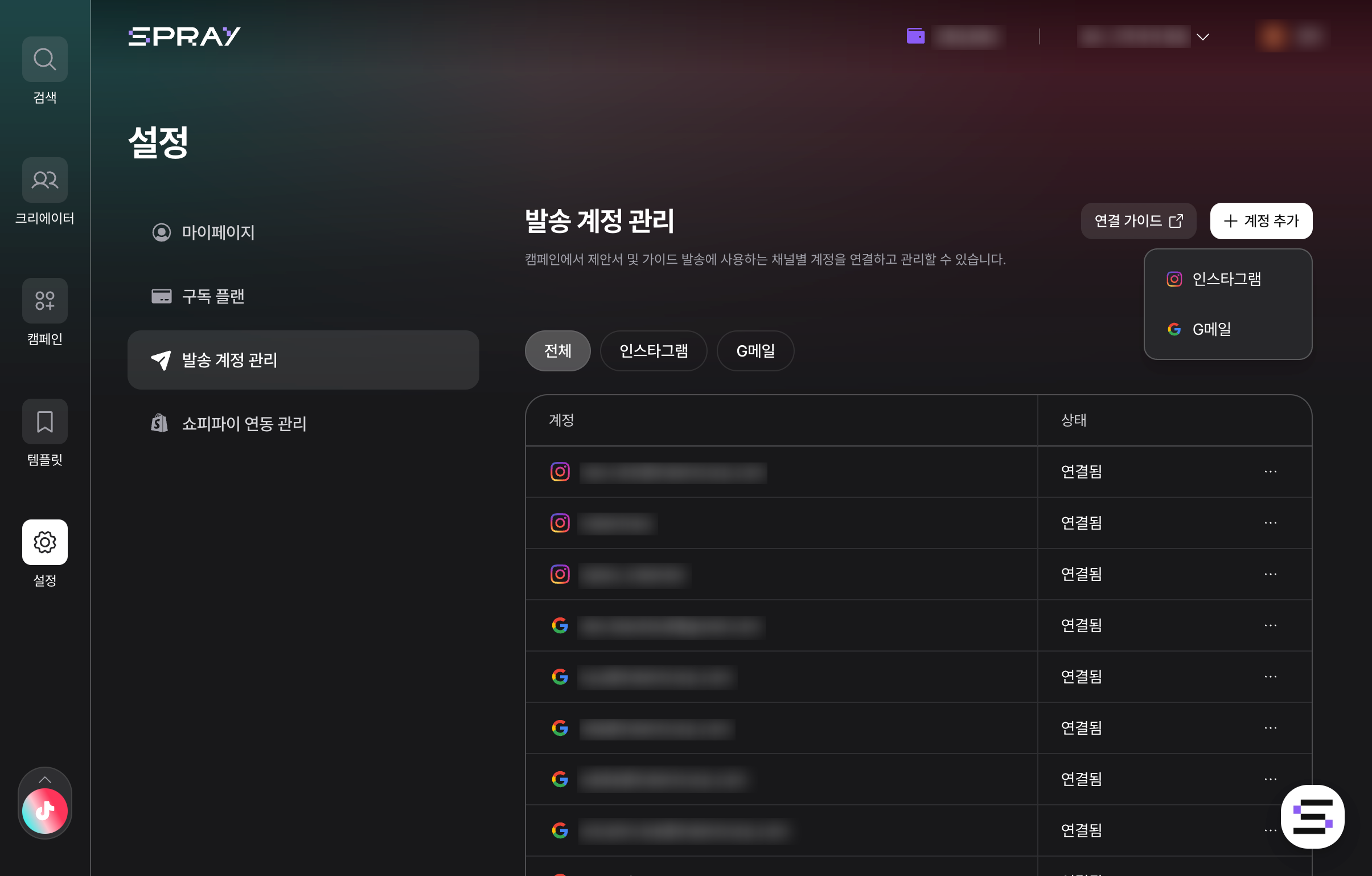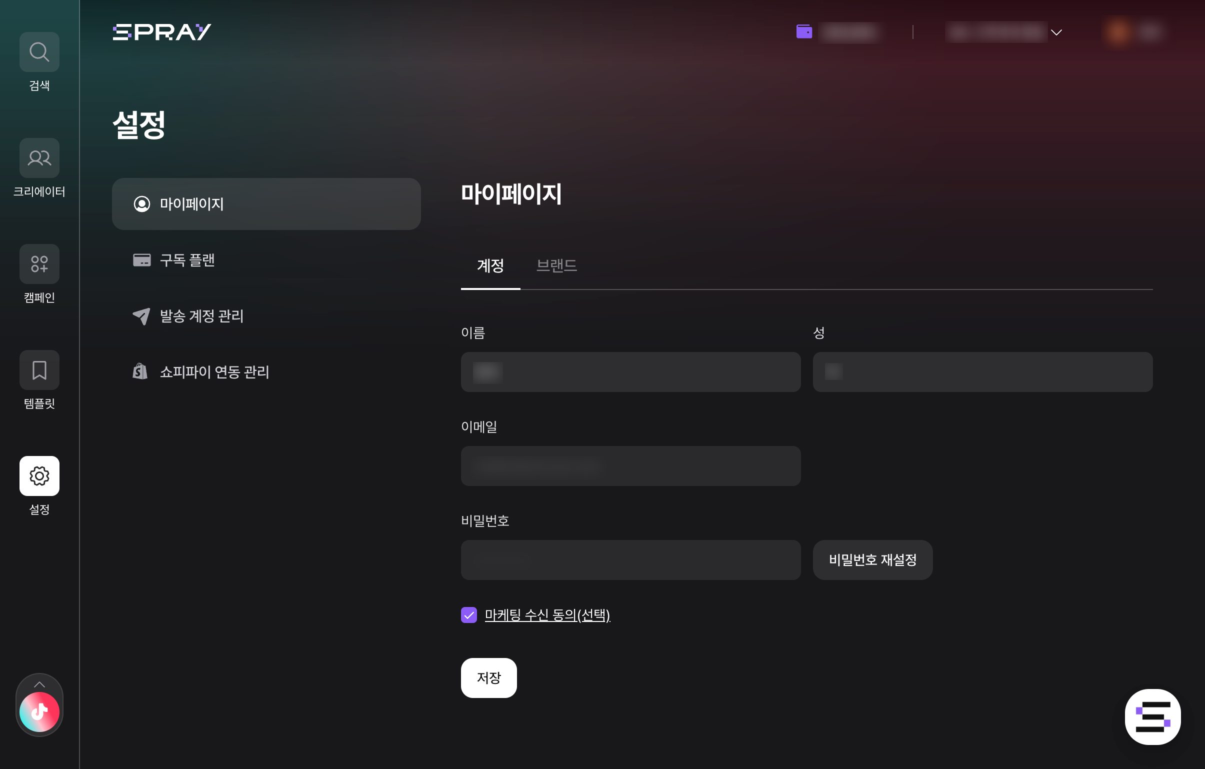마이 페이지, 구독 요금제 및 이메일/DM 발송 계정을 관리할 수 있습니다.