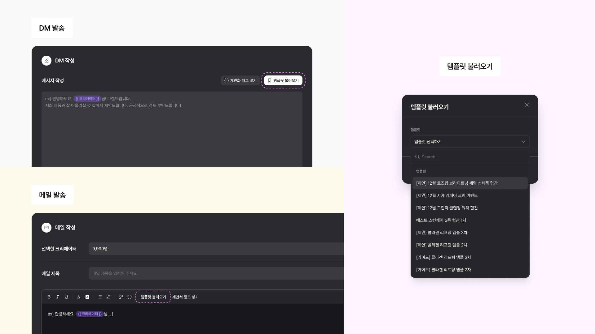 { } 개인화 태그 넣기를 사용할 경우, 크리에이터의 ID를 넣어 개인화된 메시지를 보낼 수 있습니다.