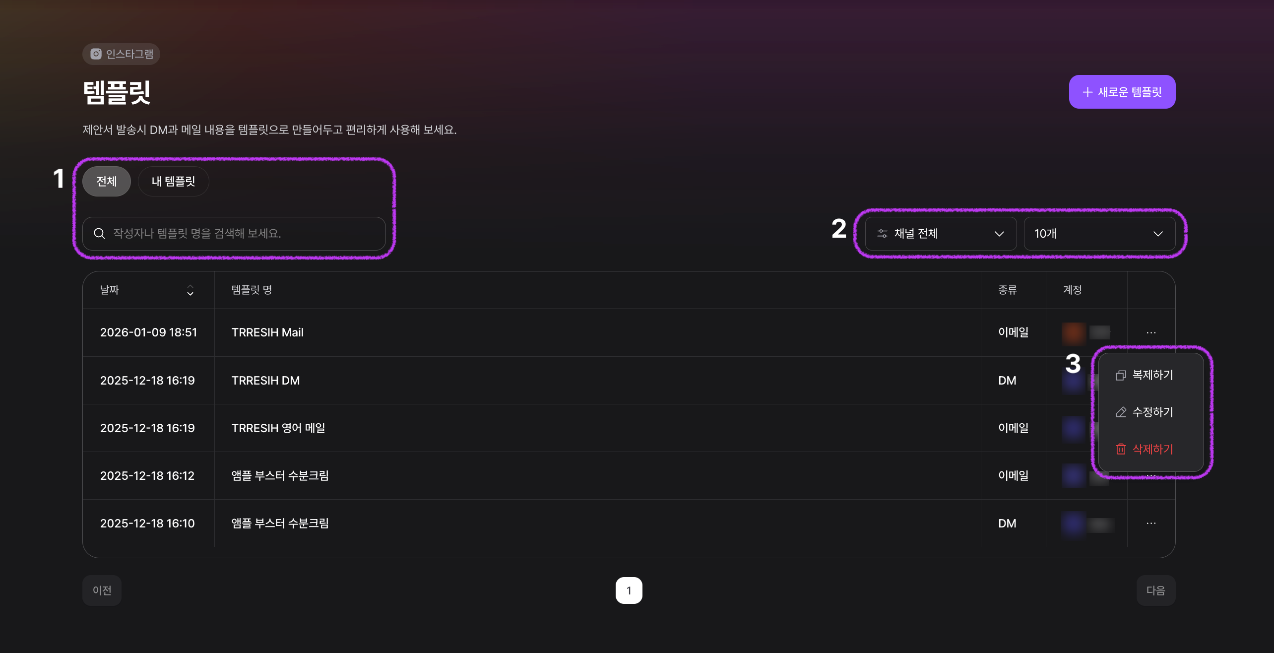 템플릿 목록에서 생성된 모든 템플릿을 확인하고 관리할 수 있어요.