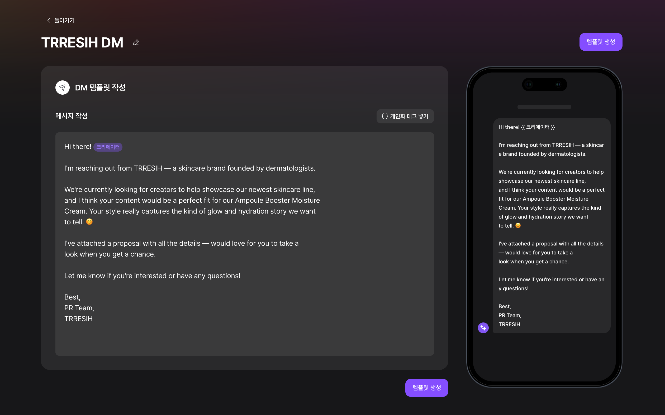 크리에이터와의 첫 메시지에 활용할 채널별 템플릿을 생성하세요.