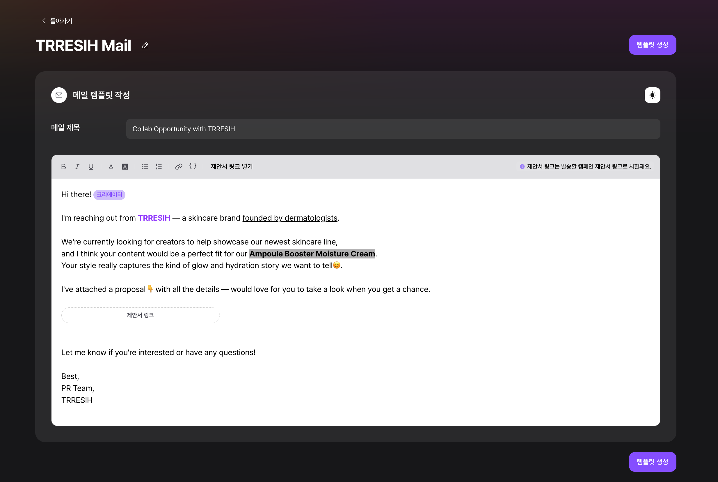{ }: 개인화 태그 넣기 버튼으로, 크리에이터의 ID를 넣어 개인화된 메시지를 보낼 수 있어요.제안서 링크 넣기: 제안서 링크 버튼을 본문에 삽입할 수 있어요. 링크는 각 캠페인 정보에 맞게 자동 변경됩니다.
